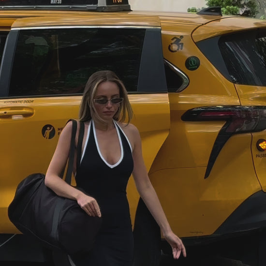 This sleek, body-hugging silhouette features a flattering halter neckline and a bold open-back design, all accented by clean, modern white outlines. Crafted from ultra-stretchy, double-layered fabric, it moves with you. Designed to make you feel confident, powerful, and effortlessly feminine.